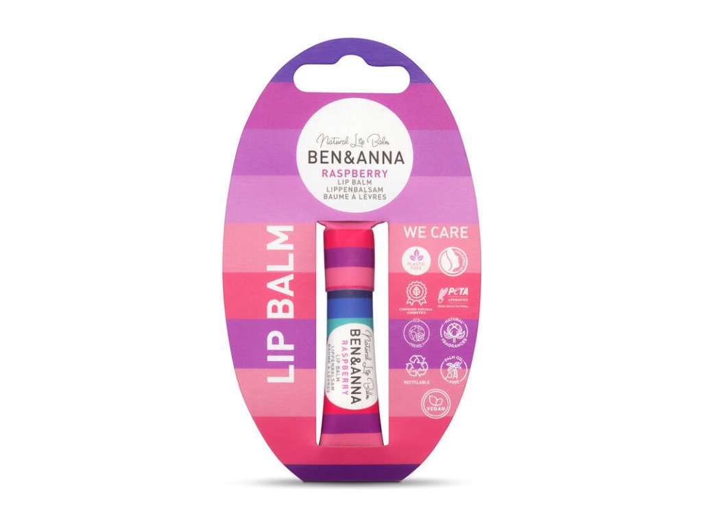 Raspberry Lip Balm Our raspberry lip balm is a delicious treat just for you. The fruity raspberry scent refreshes your senses, while the creamy texture gently cares for your lips. Enjoy the sweet hint of raspberries while your lips sway in pure comfort. In a plastic-free paper packaging. Contains 6 g. Not tested on animals, does not contain PLASTIC, suitable for VEGANS. Contains, among others: Vitamin E Castor oil In addition, the Ben&Anna brand also supports the One Earth – One Ocean organization, whose initiative is to clean the ocean from plastic waste. Ben&Anna is proud of the VEGAN, NATRUE, ICADA certificates.Additional parameters