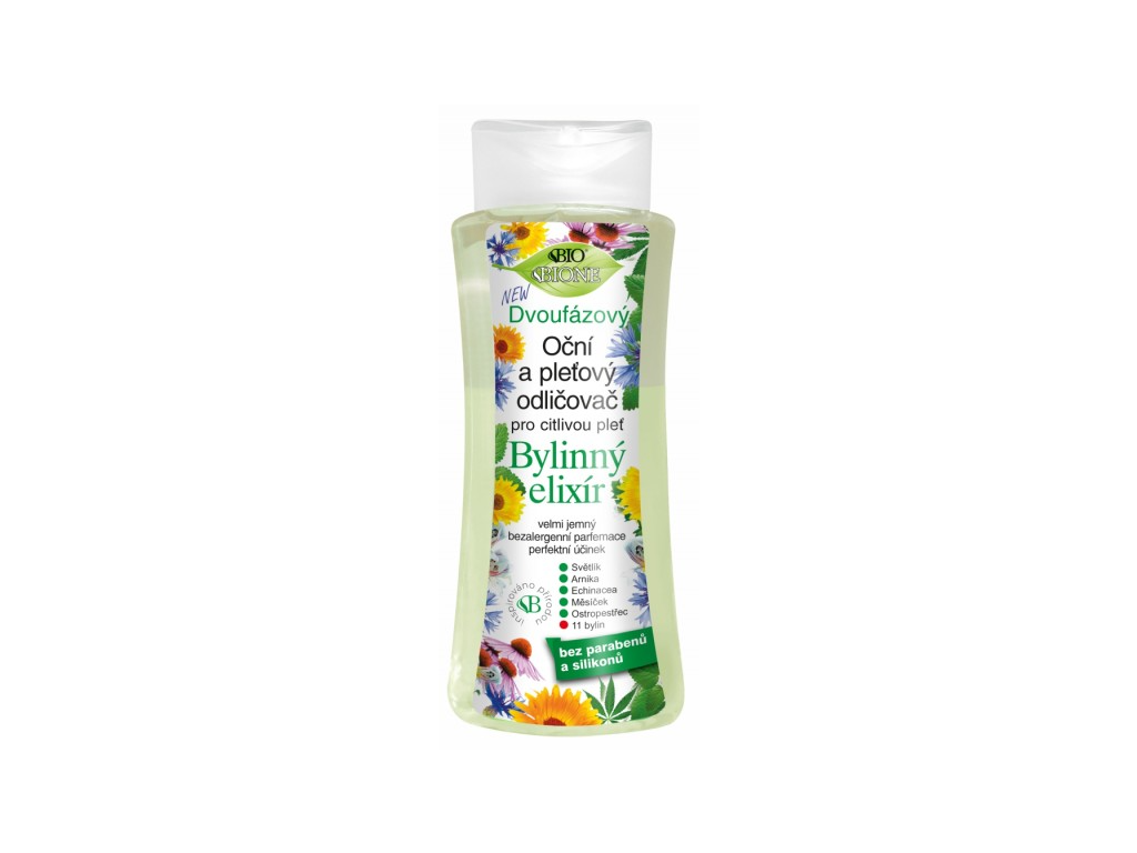 The two-phase makeup remover from the Herbal Elixir series is designed for gentle and effective removal of makeup from the eyes and the entire face , including waterproof cosmetics. It combines an oil and water component, which together ensure perfect cleansing without irritation.