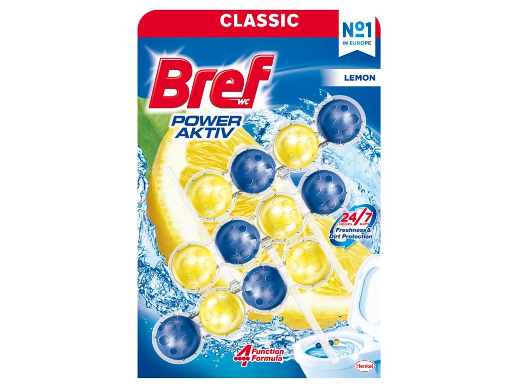 Thanks to its unique Bref formula with 4 functions, Bref Power aktiv prevents limescale deposits, creates an effective cleaning foam, prevents dirt deposits and gives your toilet extra freshness. Simply place the product under the rim of the toilet bowl, set it to the water flow and feel the freshness and cleanliness of your toilet with every flush! It lasts up to 250 flushes.