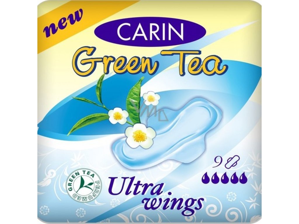Carine Ultra Wings Green Tea Ultra pads are thin sanitary pads with a green tea scent. They are individually wrapped, soft, and highly absorbent. They are designed specifically for sensitive skin.