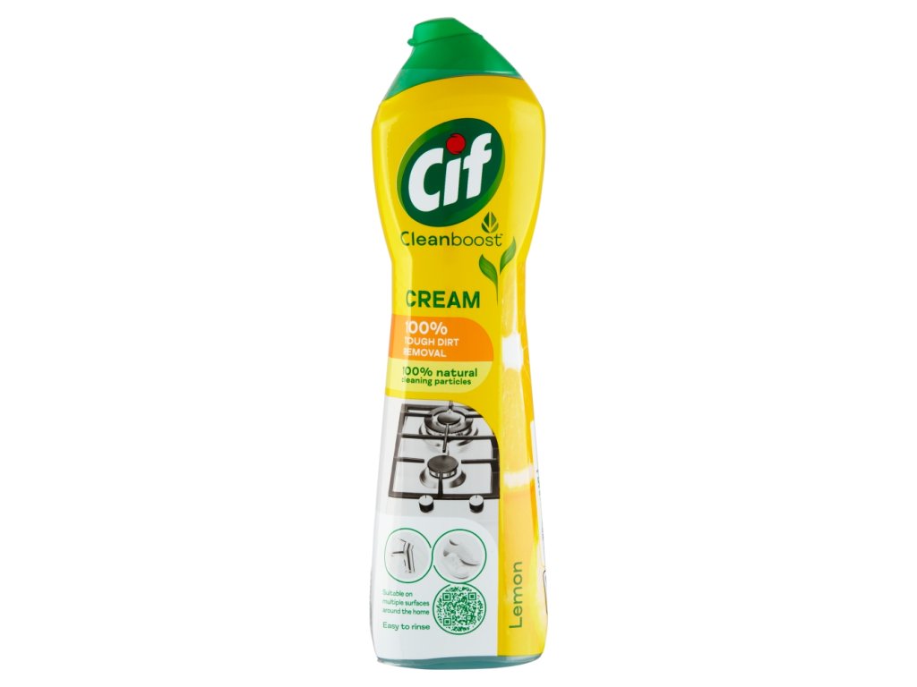 Cif Lemon Cream with a lemon scent removes even the most stubborn dirt, such as burnt-on grease, burnt-on food residue, limescale stains, mud on sneakers or dirty spots on walls, without damaging them, thanks to its 100% natural cleaning particles. It leaves surfaces clean and beautifully shiny.