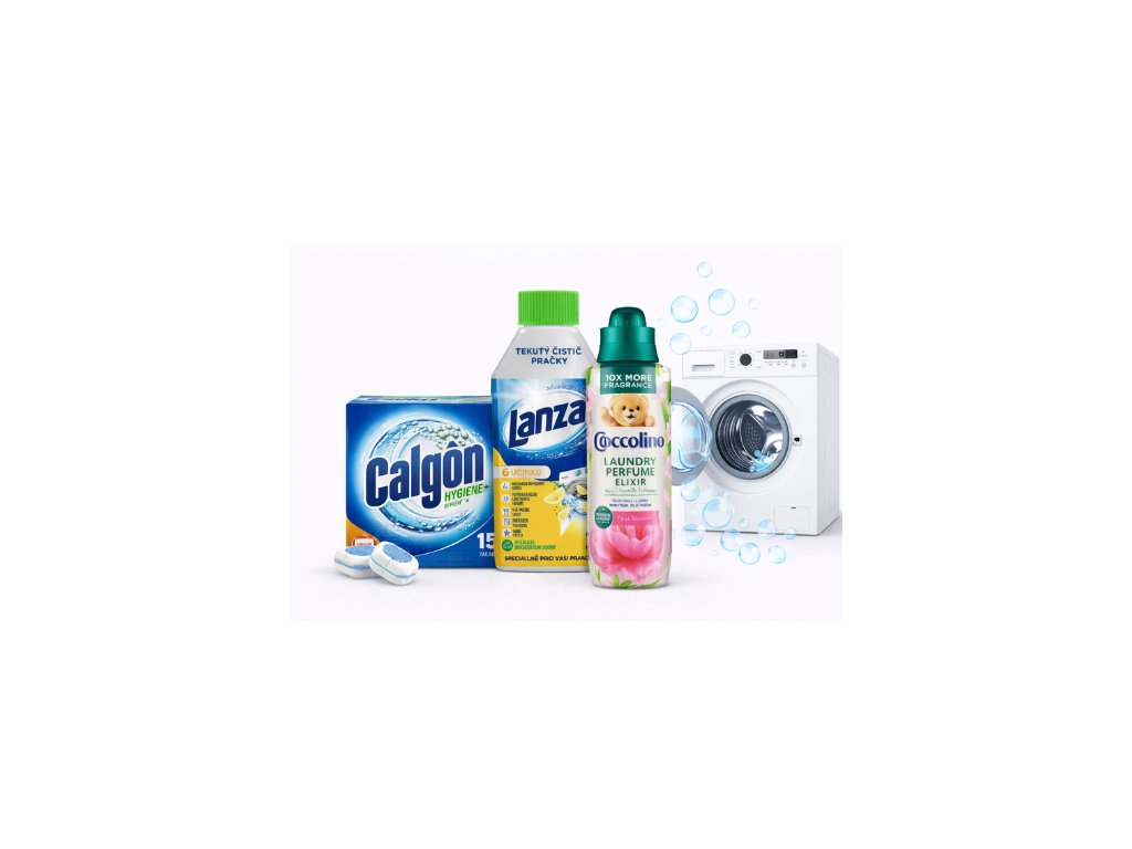 Use individual products according to the instructions on their packaging. Add Calgon tablets to the wash to protect the washing machine, use Lanza cleaner regularly to maintain the internal parts, and add Coccolino perfume directly to the fabric softener compartment according to the desired intensity of the scent.