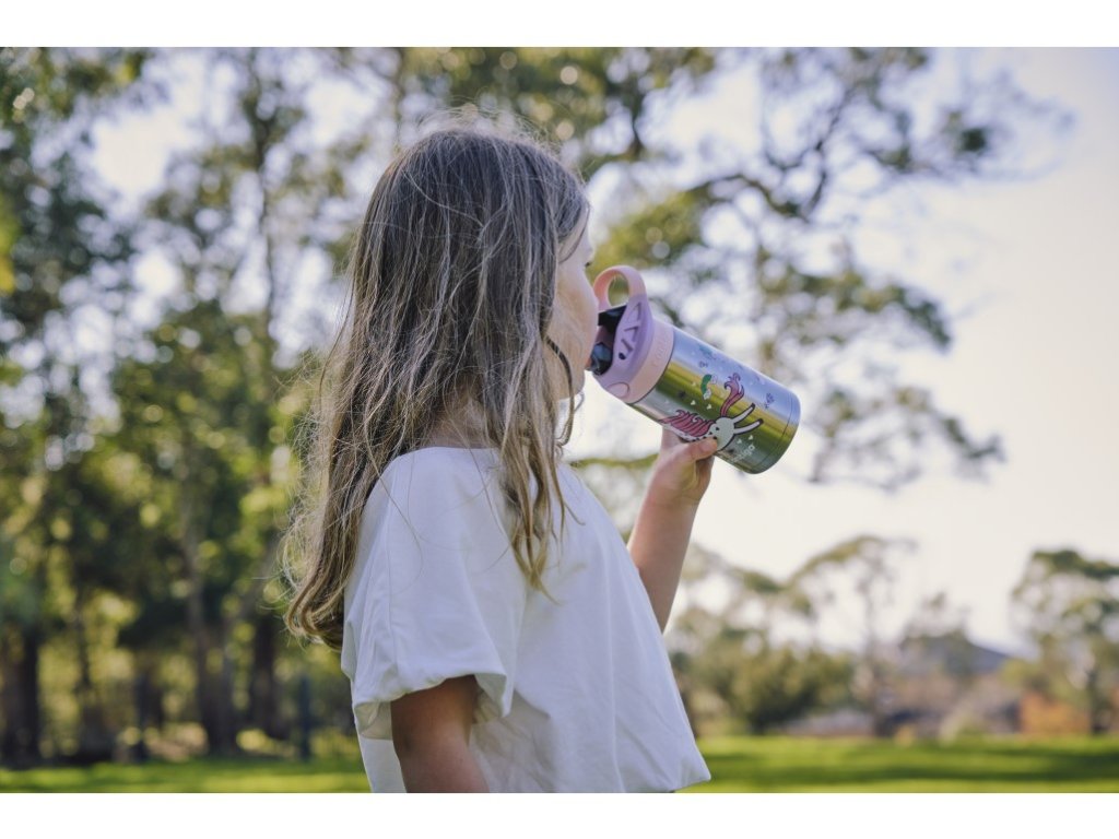 Bottle with AUTOSPOUT technology and a valve designed to minimize the risk of spills and leaks. The THERMALOCK double-wall vacuum insulation keeps drinks cold for up to 14 hours. Made of double-walled vacuum-insulated 18/8 stainless steel. The thermos bottle can be easily disassembled for thorough cleaning. The lid and body of the thermos bottle are suitable for washing in the top rack of the dishwasher. Fits in most drink holders. Soft handle for easy carrying at school and on the playground. The angled straw allows access to even the last drop. The thermos bottle is not suitable for hot drinks for drinking safety reasons. In the open position, the product is not spill-proof, so we recommend carrying it in an upright position.Additional parameters