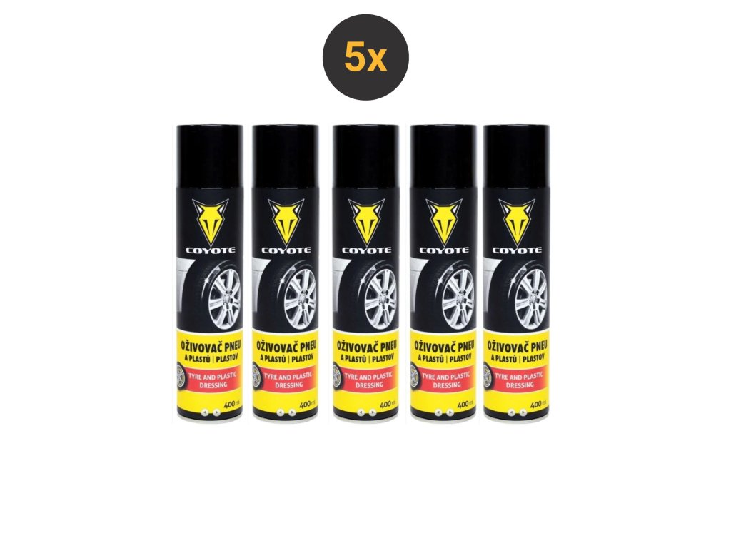 Coyote Plastic and Tire Revitalizer is a treatment spray designed to care for tires, exterior plastic parts, and all rubber components of a car. The product cleans the surface, restores the original appearance, and enhances the natural black color of the treated parts. It also helps keep the material elastic and protected from aging, UV radiation, and cracking.