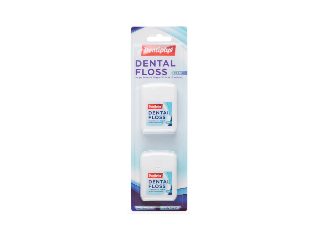 Dental floss with mint 2 x 50 m, waxed. Cleans interdental spaces, removes plaque and food debris.