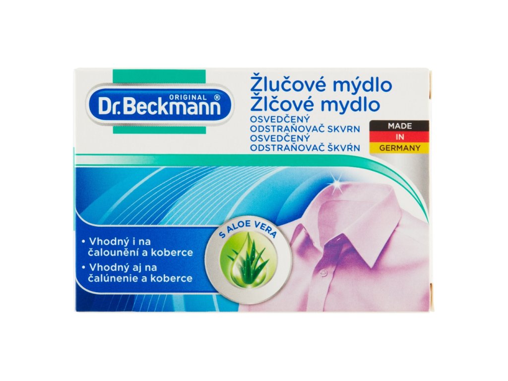 Dr. Beckmann Gall Soap removes various types of stubborn stains from all textiles, upholstery and carpets thanks to its effective composition. Gentle on textiles, with natural aloe vera. Differently beveled edges allow precise application to stains; pointed edges for small stains, wider edges for larger dirt. Special protrusions on the underside of the soap for better grip.