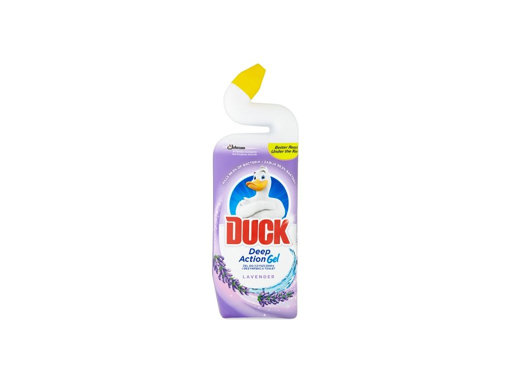 Duck liquid cleaner with lavender scent, the product cleans the toilet bowl, removes limescale and dirt. The uniquely curved neck of the bottle easily reaches under the rim of the toilet bowl, where deposits are most common. Leaves a long-lasting scent. Kills 99.9% of bacteria.