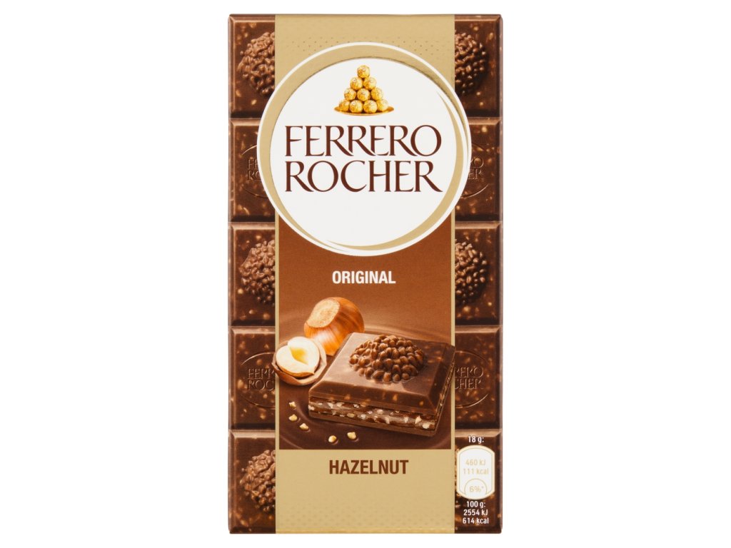 Ferrero Rocher milk chocolate with hazelnuts 90g An absolute classic in chocolate form. With the noble Ferrero Rocher you can now enjoy the intense taste of the famous golden balls bit by bit. The delicious chocolate consists of the best full-fat milk chocolate, which hides a core of fine hazelnut cream. Crunchy pieces of hazelnuts in true Rocher style ensure an unmistakable taste.