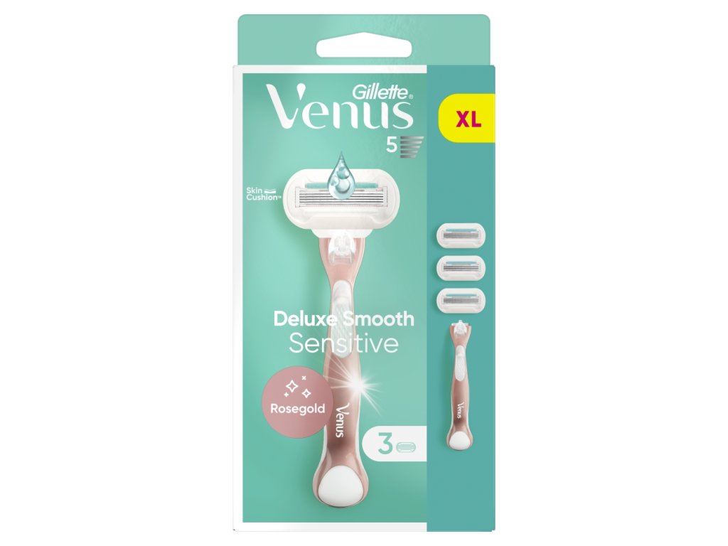 Gillette Venus women's razor blades are designed with the female body in mind. Gillette Venus Deluxe Smooth Sensitive Rose Gold women's razors are ideal for protecting sensitive skin. The shaving heads have 5 blades that provide a long-lasting close shave, and a SkinElixir moisturizing strip that releases just the right amount of protection that you can feel on your skin. All Gillette Venus replacement shaving heads can be used with all Gillette Venus razor handles (except Gillette Simply Venus and Gillette Venus bikini line).