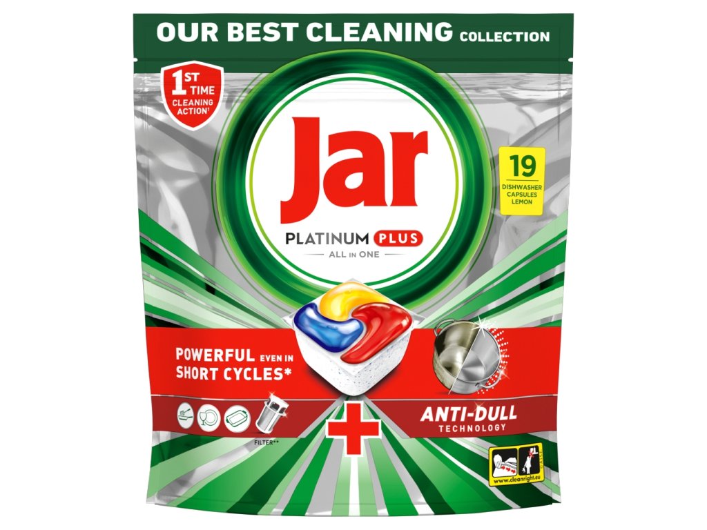 Jar Platinum Yellow PLUS dishwasher tablets are the flagship of the Jar brand. The active ingredients are separated in three separate chambers, thanks to which they are released at just the right moment. This ensures that the tablet achieves optimal effectiveness. The dishwasher tablets degrease, break down even stubborn and salt-baked food residues, help remove grayness and restore the original shine of dishes, care for glass and silver, clean the dishwasher filter and wash arms.