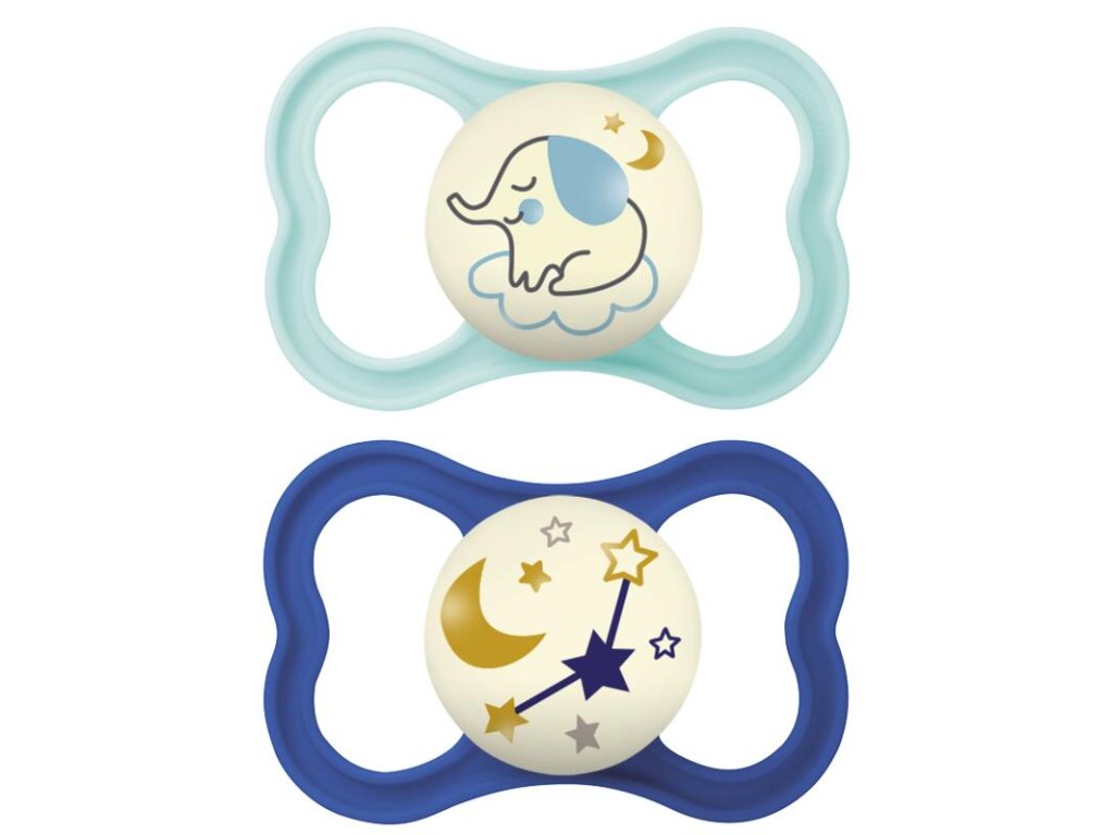 Value pack of two MAM Air Night pacifiers for children from 6 months MAM Air Night 6+ is very gentle on baby's skin thanks to extra large ventilation holes in the pacifier collar, which allow better air flow around the mouth and thus help reduce skin irritation. MAM Air Night pacifiers are specially developed for night use - the pacifier button glows in the dark, so parents and children can easily find it even at night. MAM orthodontic pacifiers are developed in close cooperation with leading medical experts for the healthy development of teeth and gums. The flat symmetrical teat made of high-quality silicone imitates the mother's breast during breastfeeding and thus supports the natural sucking reflex. In addition, it always fits correctly in the baby's mouth. 94% of babies accept the MAM SkinSoft™ silicone teat, which is as soft as baby's skin (market research 2010-2019, tested on 1,463 children in 6 countries). The button makes the pacifier easy and quick to grip and also easy to attach to the strap. All MAM products are made from BPA and BPS-free materials.Additional parameters