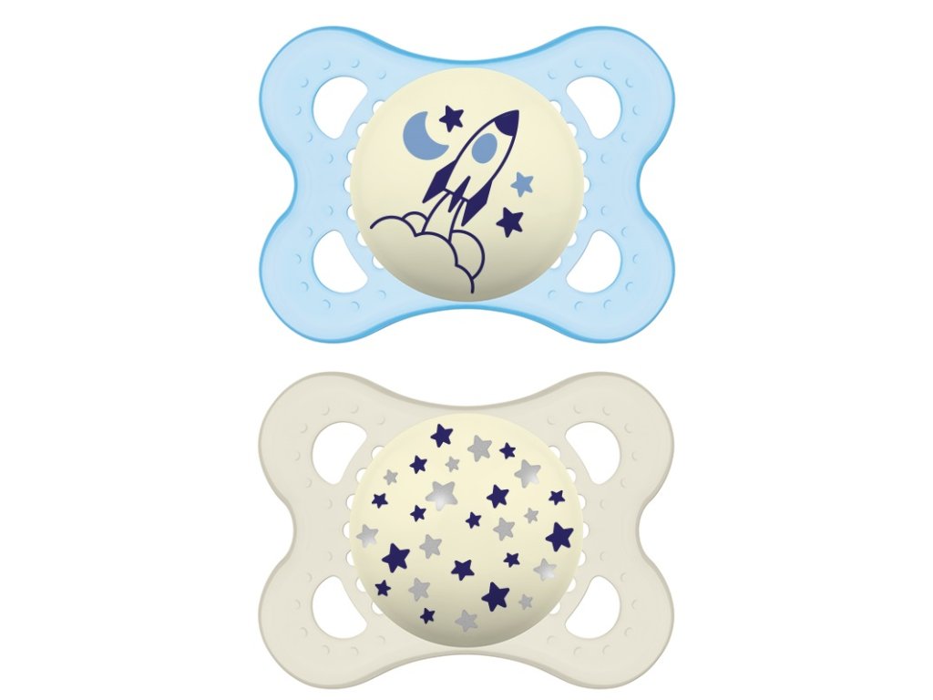 Value pack of two MAM Night pacifiers in a practical sterilization box. Value pack of two MAM Night pacifiers 0+ months in a practical sterilization box. MAM Night pacifiers are specially developed for night use - the pacifier button glows in the dark, so parents and children can easily find it even at night. MAM orthodontic pacifiers are developed in close cooperation with leading medical experts for the healthy development of teeth and gums. The flat symmetrical teat made of high-quality silicone imitates the mother's breast during breastfeeding and thus supports the natural sucking reflex. In addition, it always fits the baby's mouth correctly. 94% of babies accept the MAM SkinSoft™ silicone teat, which is as soft as baby skin (market research 2010-2019, tested with 1,463 babies in 6 countries). The pacifier is gentle on baby's skin thanks to large ventilation holes in the pacifier collar, which allow better airflow around the mouth, helping to reduce skin irritation caused by trapped saliva. The button makes the pacifier easy and quick to grip and also easy to attach to the strap. All MAM products are made from BPA and BPS-free materials.Additional parameters