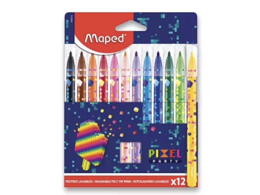 Set of 12 Maped Pixel Party colored markers in cheerful color combinations with an attractive design inspired by game codes. The markers have easily washable and washable ink. The tip is resistant to pressing or