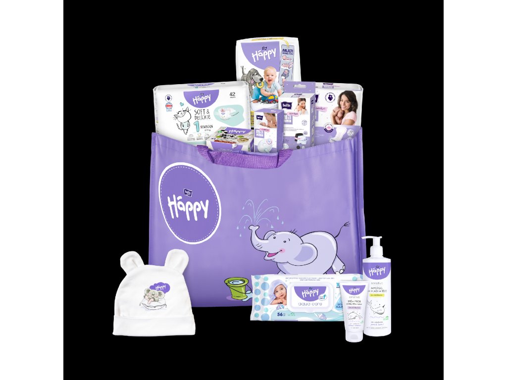 The baby set includes 42 Happy New Born diapers , Happy Baby diaper rash cream 75 ml, Happy Baby body and hair washing gel 400 ml, Happy sanitary pads , Happy baby changing pads , Happy cleaning wipes . Waiting for mom are 30 Mamma breast pads , 2 Mamma postpartum comfort XL panties, 10 Mamma comfort postpartum pads and a large Happy textile bag where everything can be stored. The Happy Koala hat is included.