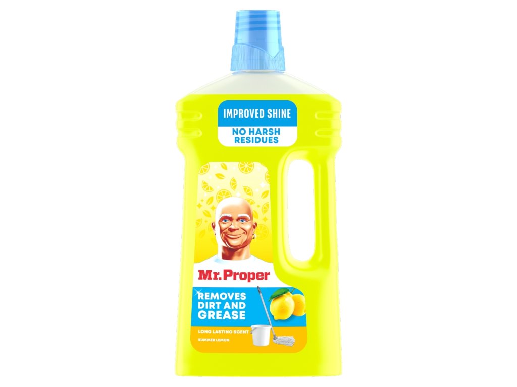 Mr. Proper Multi-Purpose Cleaner is great for cleaning almost any hard surface in your home. It's great for cleaning your kitchen sink, removing grease from your cooktop, and for cleaning your regular floors. Mr. Proper Liquid Cleaner cuts through dirt and grease and, thanks to its plant-based formula (12% of all surfactants processed), leaves no streaks. Discover our best shine yet. With a beautiful fragrance, your home will smell wonderfully fresh Lemon.