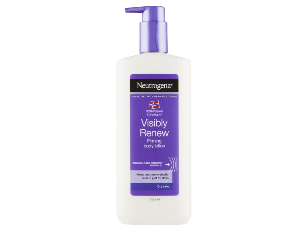 Neutrogena® Visibly Renew Firming Body Lotion. With collagen-boosting minerals*. For dry skin. This innovative body lotion not only provides long-lasting hydration, but also helps improve skin firmness and elasticity. It combines intense hydration with active minerals that help support the skin's own collagen production.* Scientifically proven difference in just 10 days. Non-greasy, fast-absorbing texture. The non-greasy texture absorbs immediately, leaving the skin with a delicate scent and a feeling of softness. Developed with dermatologists.