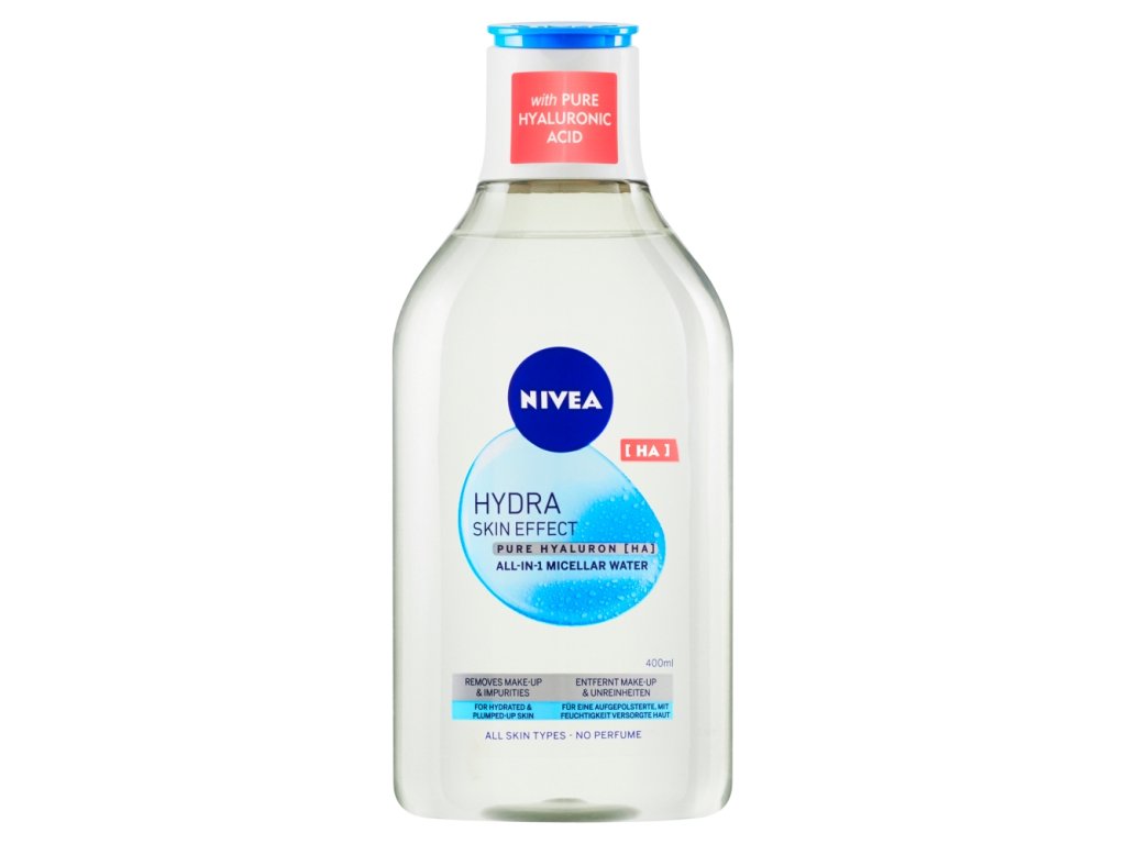 Nivea Micellar Water HYDRA SKIN EFFECT with pure hyaluronic acid thoroughly removes make-up and impurities from the skin without drying it out. It gives a feeling of hydration and refreshment. It leaves the skin soft and plump . Bottle made of 97% recycled plastic.