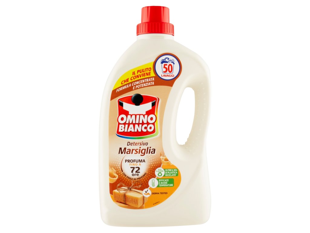 Omino Bianco 50 wash doses Marseille soap - liquid detergent containing natural Marseille soap is ideal especially for washing in a washing machine. Suitable for cotton, wool, silk and synthetic fibers. Washes delicate and colored laundry while protecting the fabric and colors. Easy to dose. Concentrated composition.