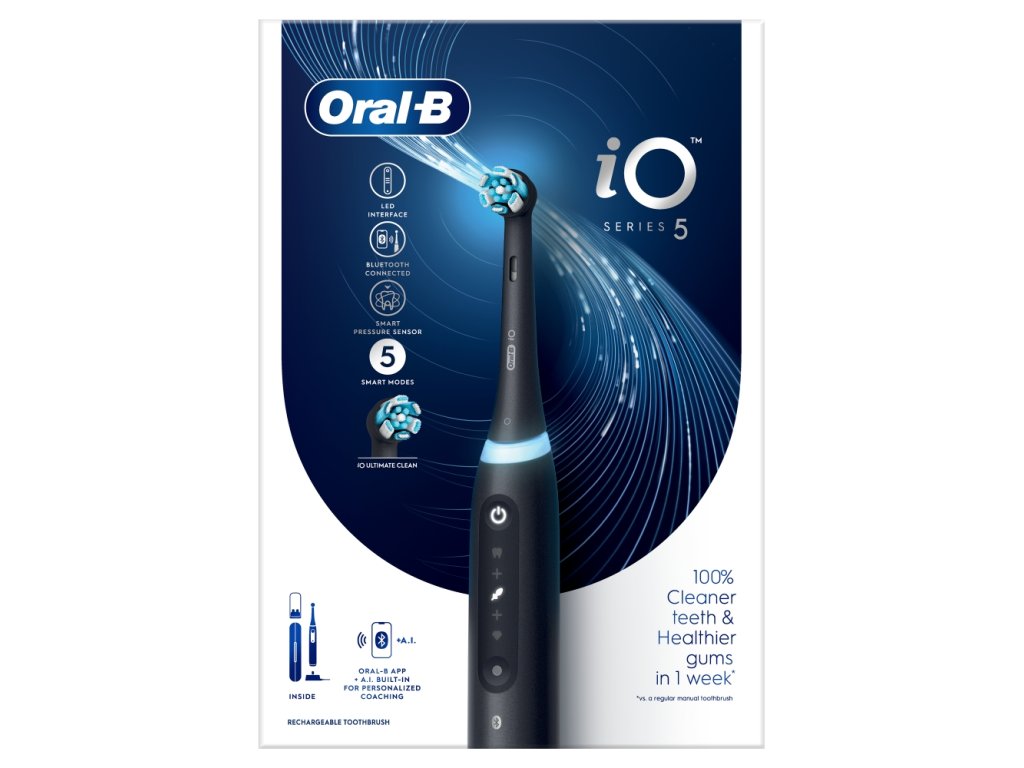 The Oral-B iO Series 5 Matt Black electric toothbrush combines a dentist-inspired round brush head with gently micro-vibrating bristles for a professional clean feeling in the comfort of your home.