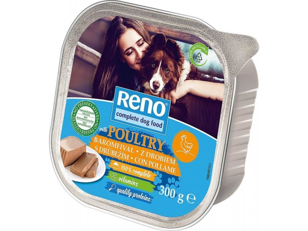 Reno tray of pâté with poultry for dogs in an aluminum tray. Complete food for adult dogs.