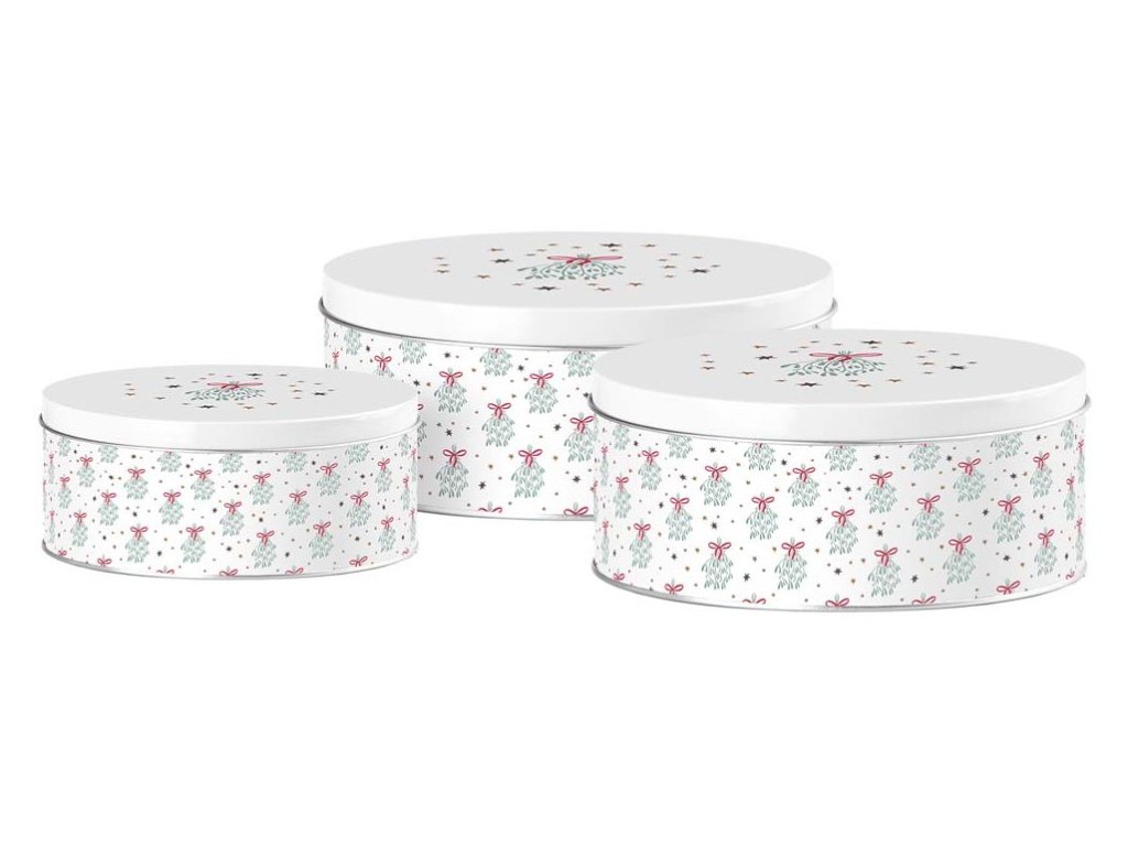 Round tin box MISTLETOE MAGIC, white, set of 3 pcs, 200x90/185x80/140x65mm