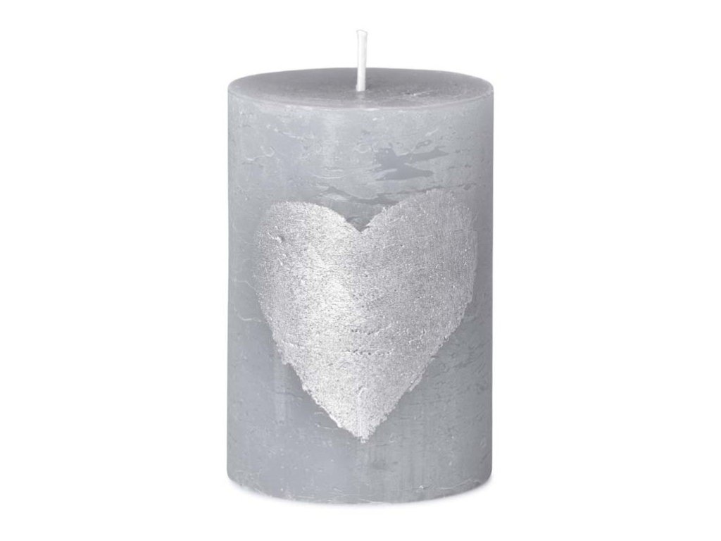 Elegant rustic cylinder candle in gray with a lacquered heart, ideal for pleasant evening moments. Its dimensions are 70 x 100 mm.Additional parameters