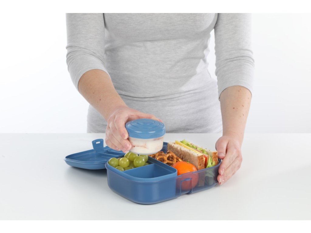 With an innovative three-compartment design and a movable divider, this box keeps food separate and fresh until ready to eat. Also included is a 130ml Mini Bite™ with a leak-proof screw-on lid, ideal for yoghurt, dressings or sauces. Benefits: • Ideal for children • 130ml Mini Bite™ container for yoghurt, dressings or sauces • Movable divider • Three compartments • Made from 35% recycled plastic • Eco-friendlyAdditional parameters