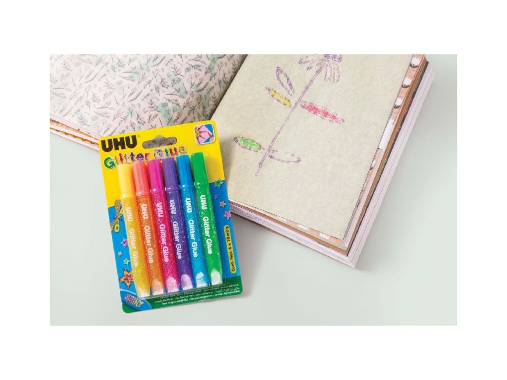 The colorful creative set UHU Glitter Glue Shiny brings a beautiful glitter effect! The glue contains glitter particles that, after drying, stay in place and create beautiful effects. The extra soft tube with a precise applicator allows for easy and clean application and does not drip. It is solvent-free and washable. Dermatologically tested - however, it is not a cosmetic product. Rinse with water if it comes into contact with the skin. SCOPE OF USE: You can decorate a wide range of materials, including Easter eggs. Make your own PF, congratulations, decorate a photo frame. Just remove the cap - and start decorating! INSTRUCTIONS FOR USE: Remove the dosing pencils from the packaging, put them in a glass upside down so that the gel can flow into the applicator. The pencils are made of soft material and are easy to work with. Press lightly to squeeze out the gel with sequins and write, paint, draw. The gel is solvent-free and dries in 4-6 hours, depending on the ambient temperature and the amount of application. Once dry, the gel is gone, leaving only a layer of beautiful glitter.Additional parameters
