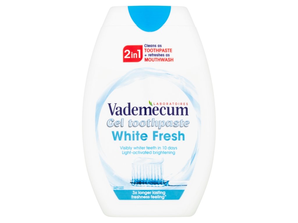 The innovative composition of Vademecum 2in1 Oxy White Fresh with active oxygen removes traces of discoloration. After using it, your teeth will shine with their natural whiteness again. The active ingredients of Vademecum Oxy White Fresh immediately tackle unwanted stains caused by coffee, tea or tobacco. Vademecum Oxy White Fresh also copes with bacteria that are washed away when brushing your teeth. This ensures 100% fresh breath - a prerequisite for a smile.