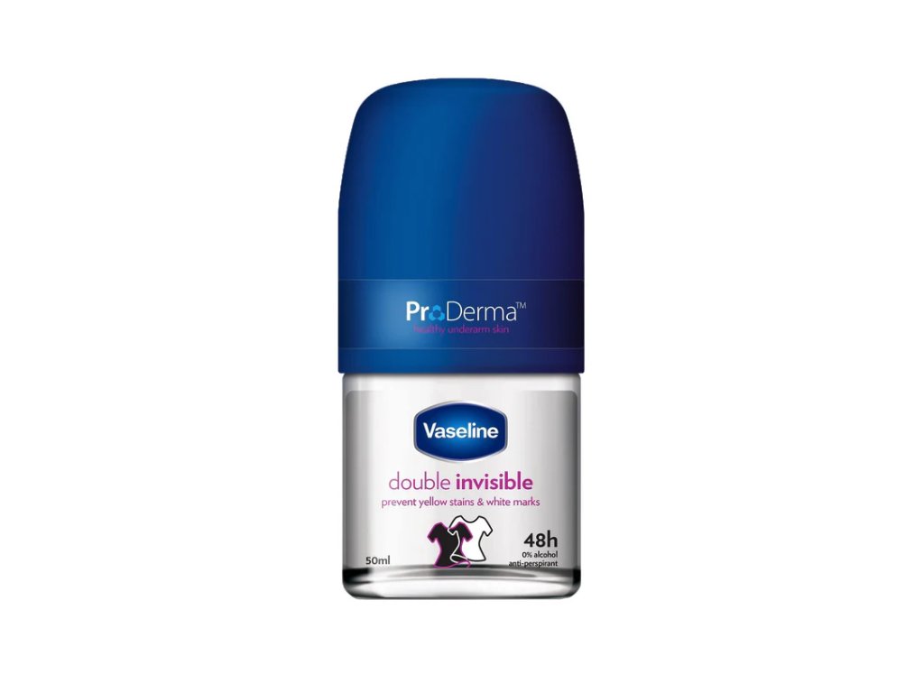 Vaseline Double Invisible 48h Anti-Perspirant Roll-On provides long-lasting, reliable protection against sweat and odor for up to 48 hours. Infused with ProDerma skin care complex, it helps protect delicate underarm skin while keeping you feeling fresh. The dermatologically tested formula is gentle on skin and won't stain clothes. This vegan formula is free of alcohol and aluminum salts, ensuring safe and effective protection for your skin.
