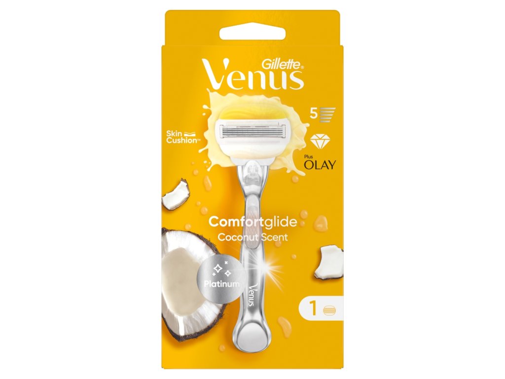 Gillette Venus ComfortGlide Women's Razor Coconut Scent Plus Olay has 5 blades for a smooth, close shave that lasts. It lathers, shaves and exfoliates. The replacement shaving heads are equipped with Olay moisturizing strips that release body butters with a delicate coconut scent for a smooth glide and comfort. The ergonomic platinum handle with a comfortable grip and a pivoting head adapts to the curves of your body. Keep the handle, just change the heads: