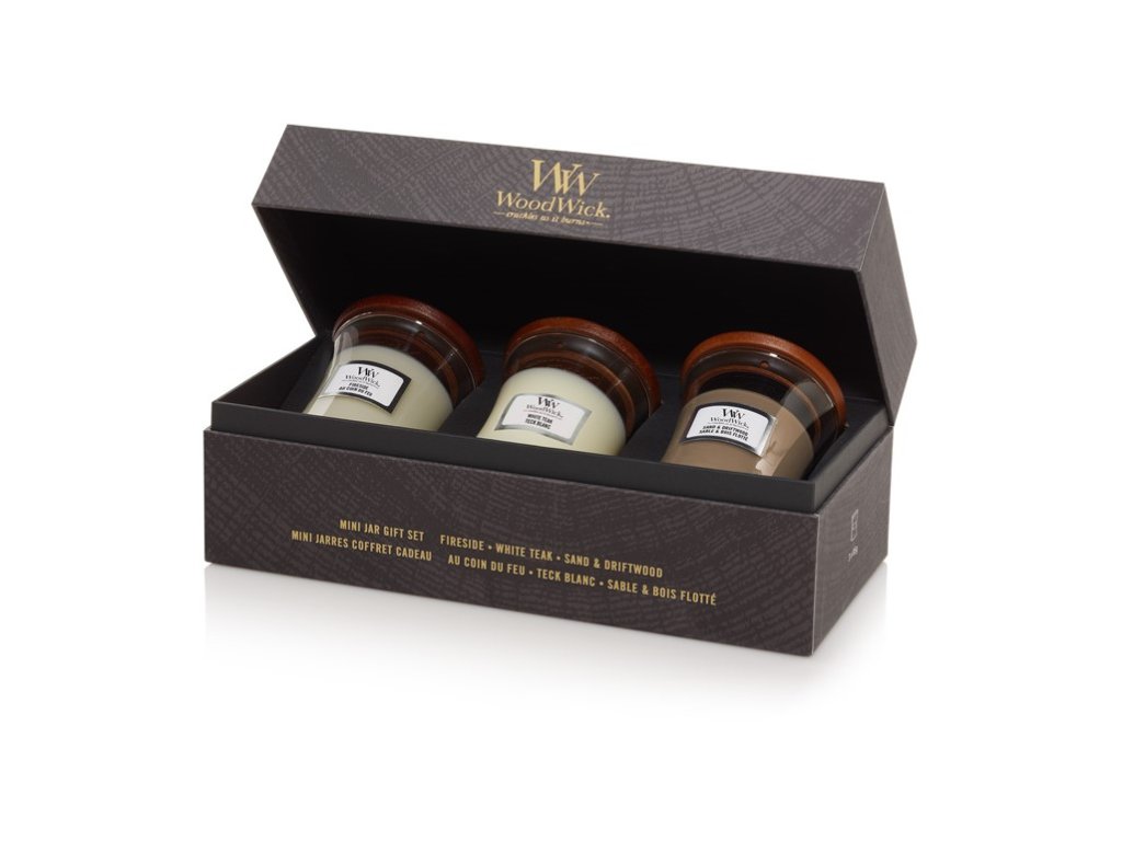 Elegantly packaged, this men's woody scent gift set includes Fireside, White Teak and Sand & Driftwood mini candles. Fireside brings the signature scent of logs in a burning fireplace, White Teak is a fresh composition of woods, moss and the sea, and Sand & Driftwood enchants your senses with the scents of citrus, ozone, cedar and cypress. Each candle provides up to 30 hours of fragrance, accompanied by the gentle crackling of the iconic wooden wick.Additional parameters