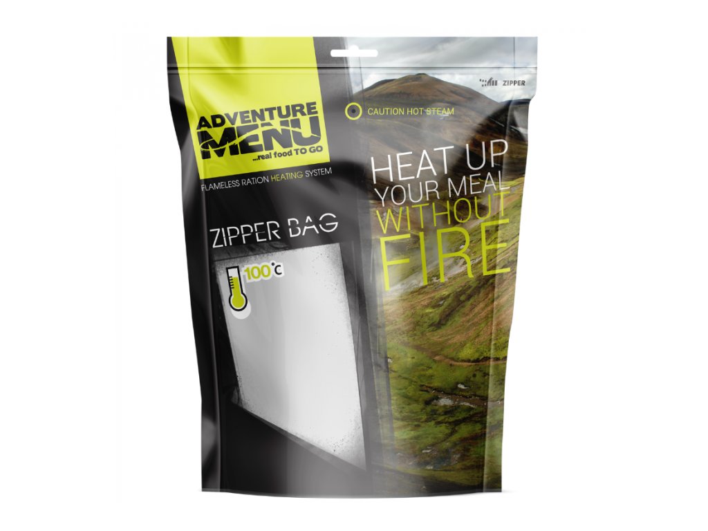 Zipper-bag is a practical bag made of durable plastic that can withstand high temperatures and other demanding conditions. You can conveniently prepare a hot meal in it with the help of a self-heating capsule from the Adventure Menu brand. An exothermic reaction involving calcium oxide and water is used for heating. However, you don't have to worry about your safety. The zipper-bag closes tightly, so all chemical reactions take place only inside. Up to two dishes can be heated in the bag at the same time. Thanks to this, you can enjoy a joint lunch with your partner in the mountains without having to share your portion.